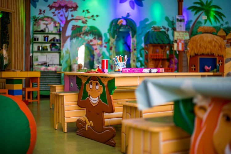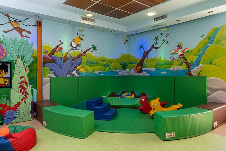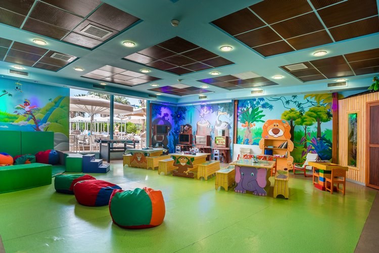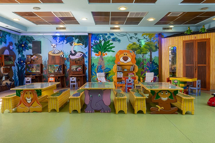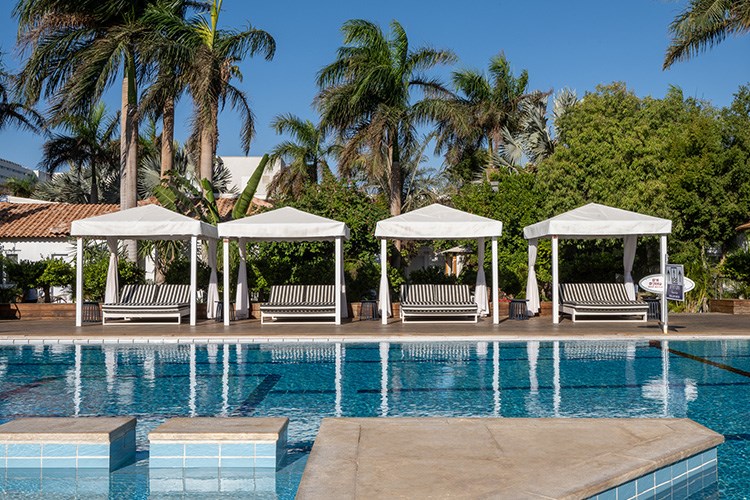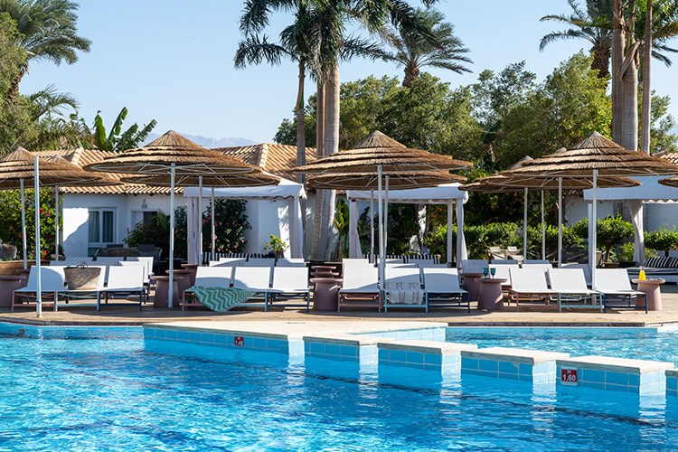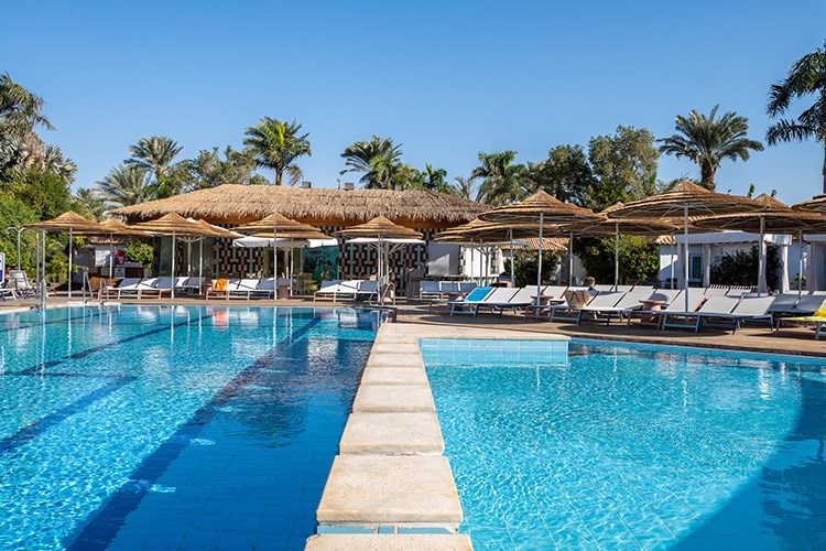 בריכת שחייה גדולה מוקפת בעצי דקל עם מיטות שיזוף וערסלים. לילדים ולפעוטות בריכת שחיה מופרדת עם מים רדודים.
